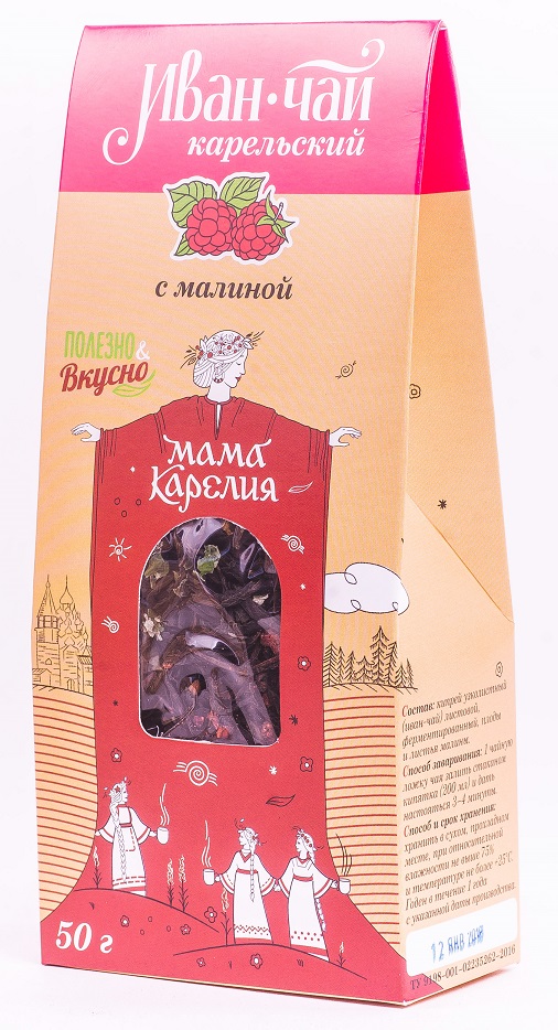 Напиток чайный "Иван-чай карельский" крупнолистовой с ягодами и листом малины, лесного сбора, контролируемый по месту происхождения - Республика Карелия, Суоярвский район. Картонная коробка, полипропиленовый пакет с клеевым клапаном, 50 гр.